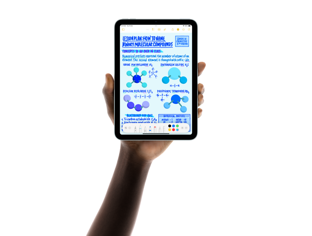 The blazing-fast A17 Pro chip makes iPad mini a portable powerhouse. It delivers a big boost in performance and it’s built for Apple Intelligence. The 16‑core Neural Engine is up to 2x faster than the previous generation. The 5‑core GPU brings advanced features like hardware‑accelerated ray tracing for graphically intense triple‑A games. And you can work, play, and create from anywhere with all‑day battery life.3