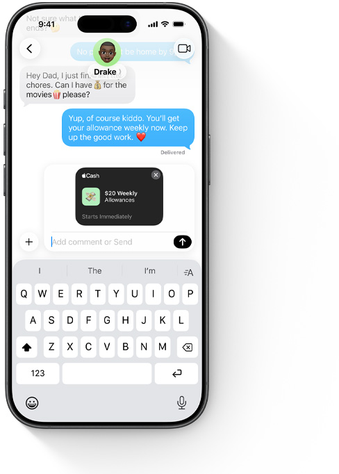 With Apple Cash Family, you can set up Apple Cash for anyone in your family under 18. Easily and securely send money for allowance, shopping, or just because. Even set up recurring payments to keep allowances on a schedule. The funds go right to their own Apple Cash card in Wallet, ready to spend with Apple Pay. Or they can transfer the money to their bank account to save for the future. You can view your child’s balance and activity at any time. You can apply certain restrictions to their account. It’s the perfect amount of financial freedom for a child — with built-in protections for your peace of mind.