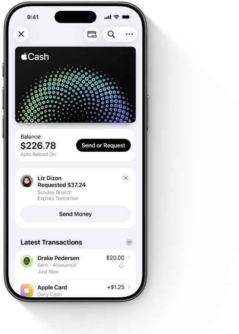 Apple Cash is an easy and private way to send and receive money, and it’s built right into iPhone. You can send Apple Cash in Messages, in Wallet, or with Tap to Cash. And because Apple Cash is a digital card in Wallet, you can spend your Apple Cash in stores, online, and in apps with Apple Pay. You can also set up Apple Cash for family members under 18 years old, so you can safely send them money they can spend with their own Apple Cash card.