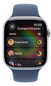 O Apple Watch oferece uma maneira divertida de ficar e continuar em forma. Faça uma competição diária em família para ver quem fecha primeiro os círculos Ficar em Pé, Movimento e Exercício. No final, todo mundo sai ganhando.