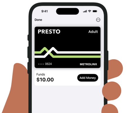 Add funds to your PRESTO card in seconds directly in the Wallet app — no need to stop at the ticket machine.