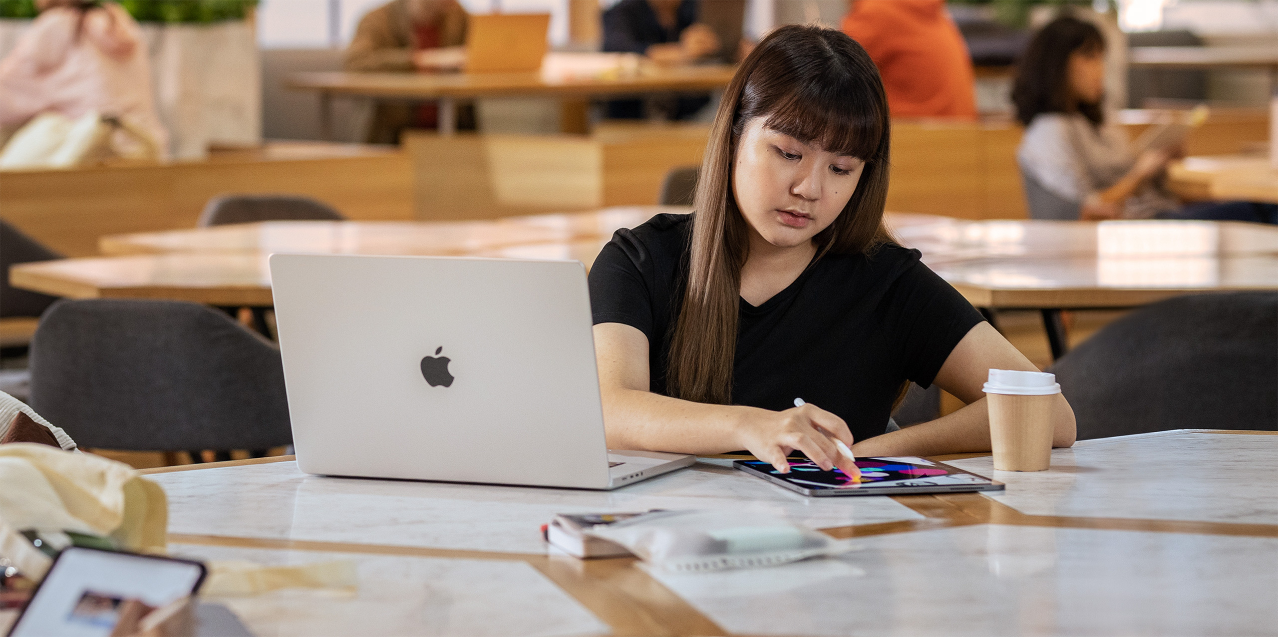 La inspiración puede llegar en parques o cafeterías, en cualquier momento y lugar, comenta Suwara. Notas de Voz en el iPhone le ayuda a capturar sus ideas. Luego, hace bocetos con el Apple Pencil en el iPad y crea las composiciones finales usando Adobe Creative Suite en el MacBook.