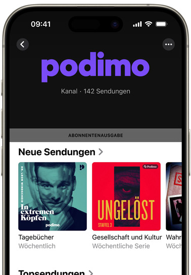 • Apple Podcasts Abonnements ist ein globaler Marktplatz, auf dem du Premium-Abonnements von deinen Lieblings­produzent:innen entdecken kannst. Dein Premium-Abonnement bietet dir eine Reihe von Leistungen, die von den Produzent:innen kuratiert werden, wie z. B. Zugang zu zusätzlichen Inhalten, werbefreies Hören und früherer oder exklusiver Zugang zu neuen Serien.