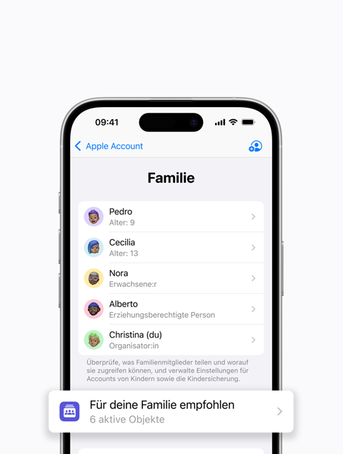 Du kannst Tipps und Vorschläge erhalten, wie du Features für Familien optimal nutzen kannst. Öffne einfach „Einstellungen“, tippe auf deinen Namen, auf „Familie“ und dann auf „Für deine Familie empfohlen“.