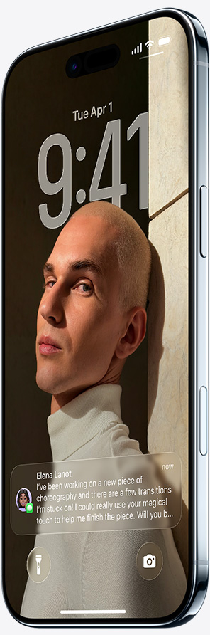 Tampilan waktu disesuaikan secara dinamis dengan wallpaper foto dan pemberitahuan, sehingga subjek Anda tetap menjadi fokusnya. Saat Anda menggerakkan iPhone, foto Anda terlihat hidup dengan efek 3D baru.15