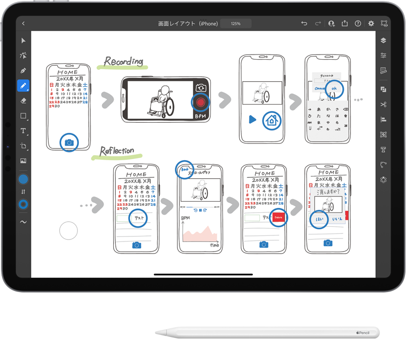 iPad Pro。飯村博士和他的學生使用 iPad、Apple Pencil 及 Adobe Illustrator 來繪製草圖和故事板,以製作一款輔助使用 app,協助教師與非語言表達的學生進行溝通。