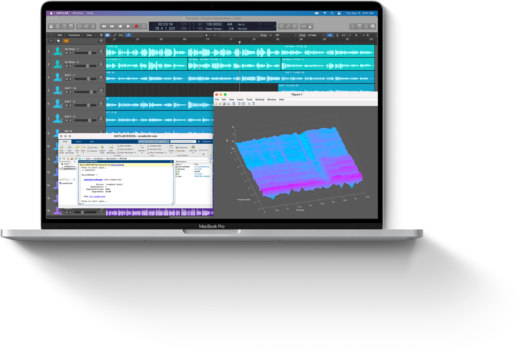 MacBook Pro。Mac 可以輕鬆操作 Logic Pro 和 MATLAB 等專業音樂和視覺展示 app,讓 Kim 博士利用自己研發的樂器和機械人,為他的機器聆聽研究拓新疆界。