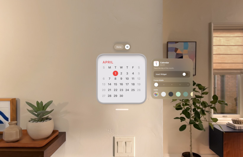 With widgets, you can arrange your favourite information and apps — like Photos, Clock, Music and Calendar — in your space exactly how you want. Customise their frame thickness, colour and depth, and find them just where you left them, every time you put on Apple Vision Pro.